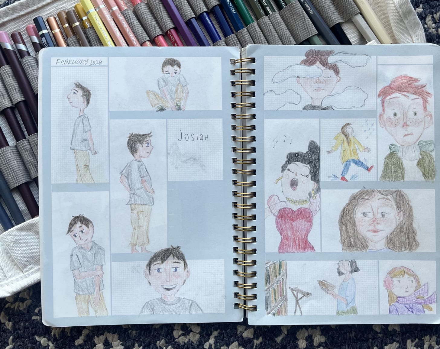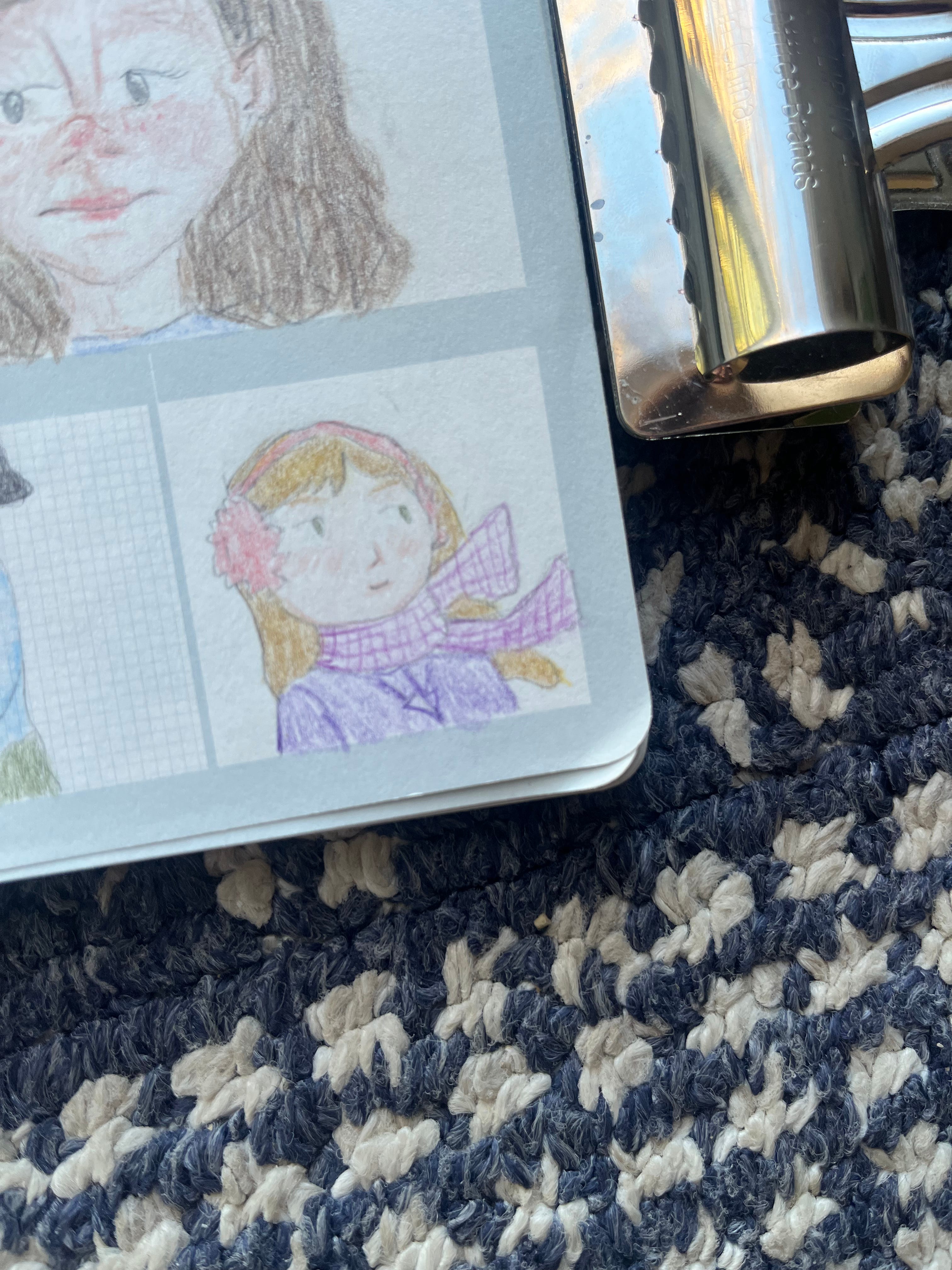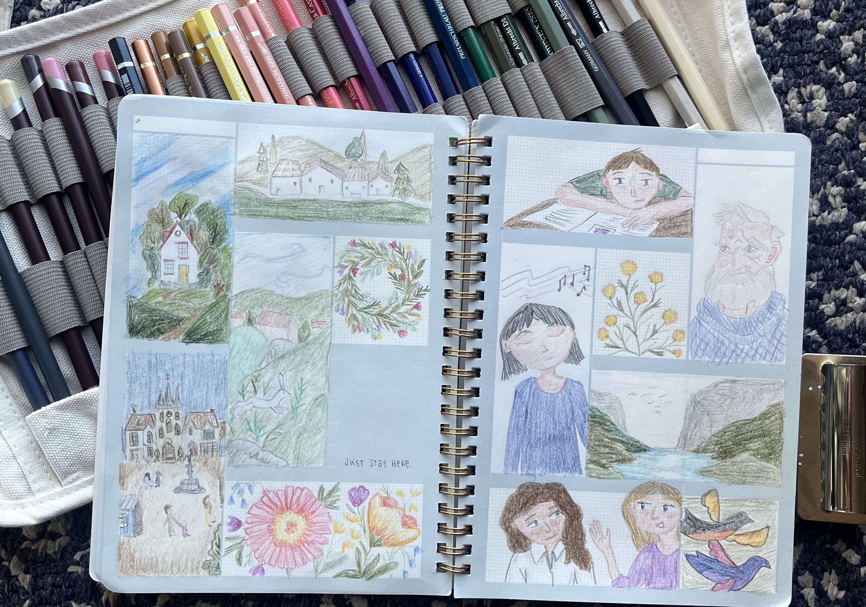 I did- I did! Keep up my short and sweet (and highly constrained) square in the journal project. I did allow myself to expand out into my favorite colored pencils and palette, instead of being restricted to that limited 24 pencil set from one brand. I also sort of let my hand wander where it would; they aren’t all character studies or people. I went with what ever brought joy that day. The guy from the beginning of my letter was modeled off of a sculpture, and I really like how he turned out. Here they are below. I’d love to hear what your favorites are or what caught your eye. I haven’t been sharing these to social media, just here, and it’s been a nice change. I kind of miss hearing what people like about them though- it helps me to learn and refine. So do tell!