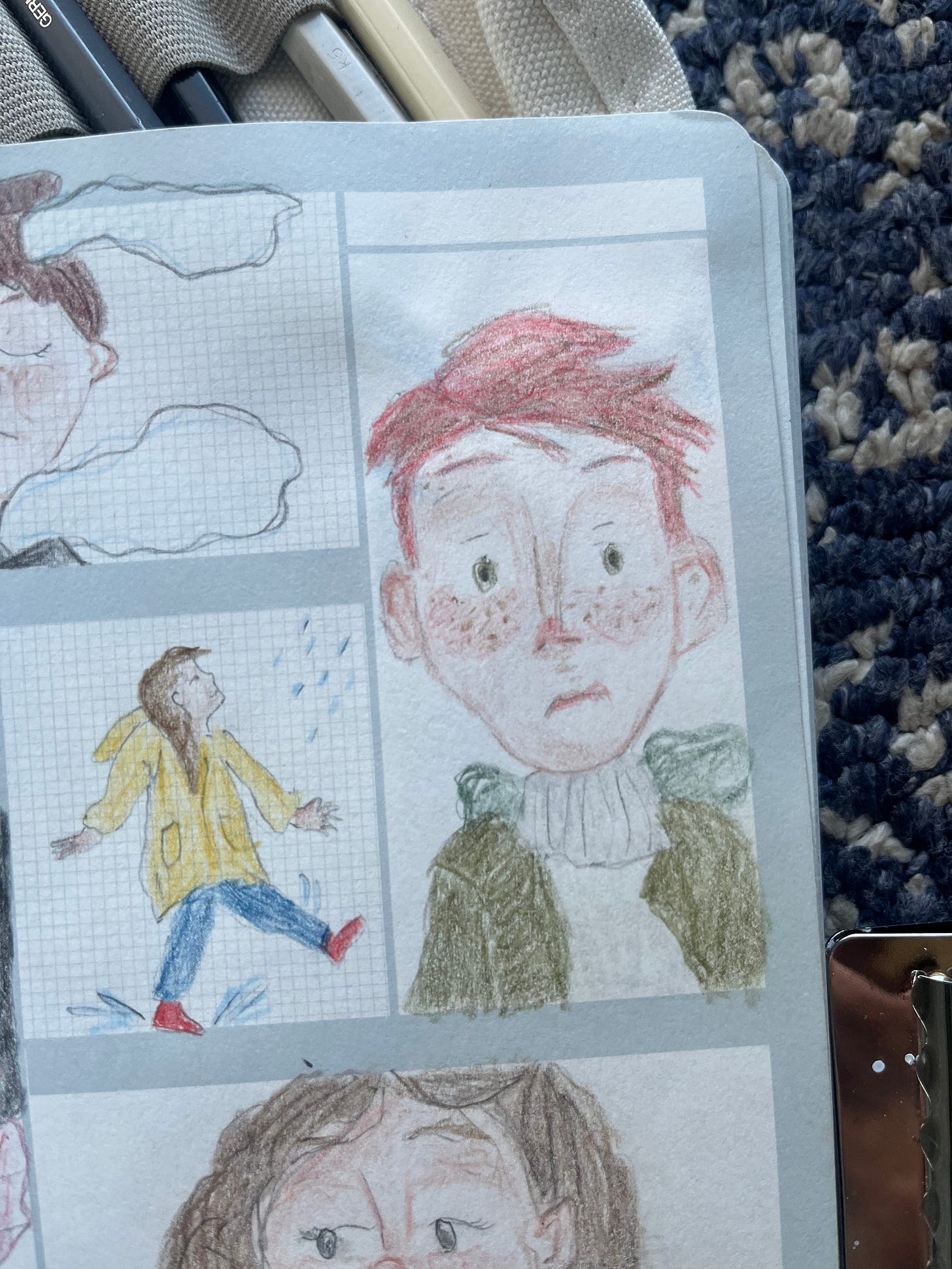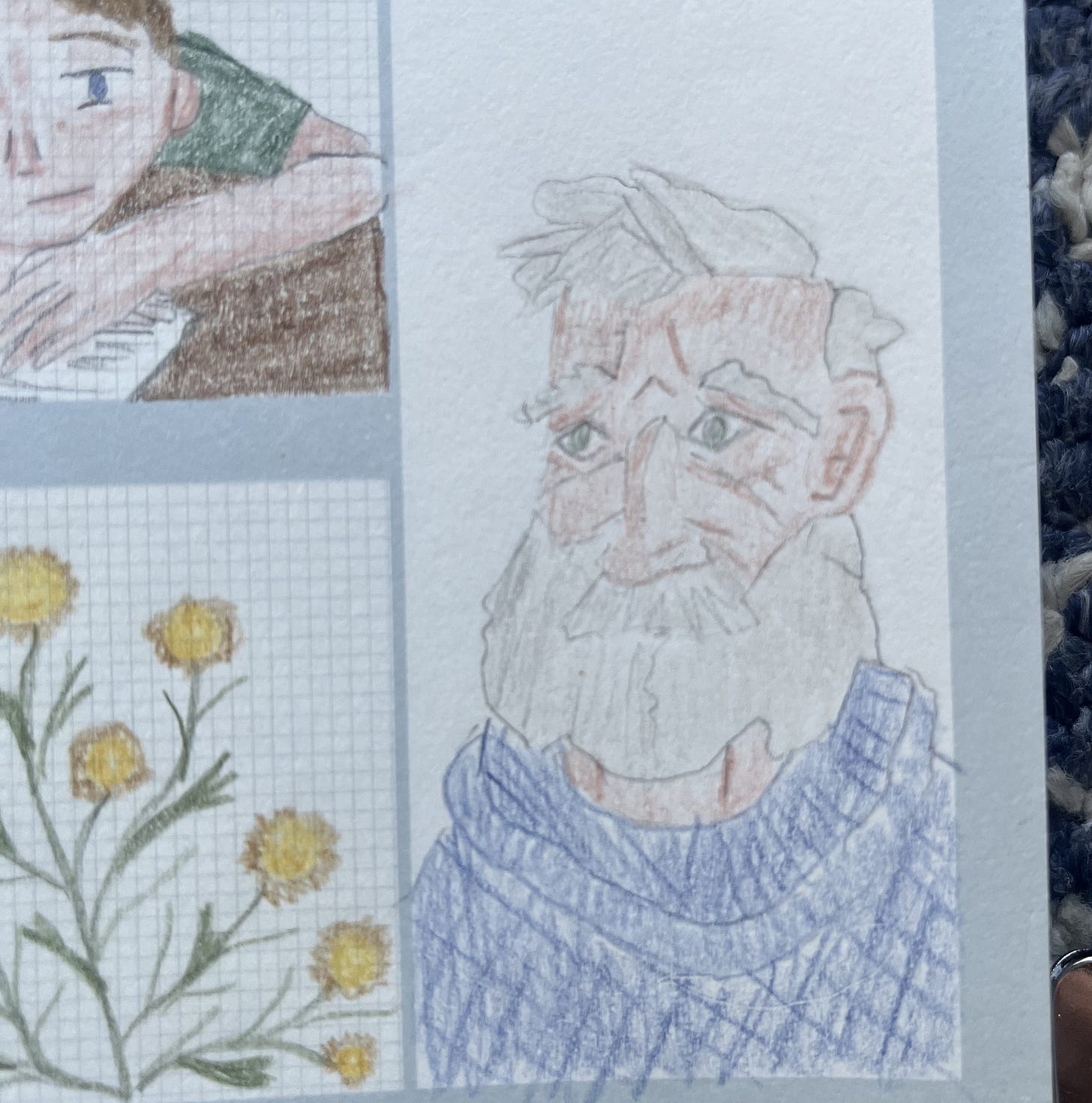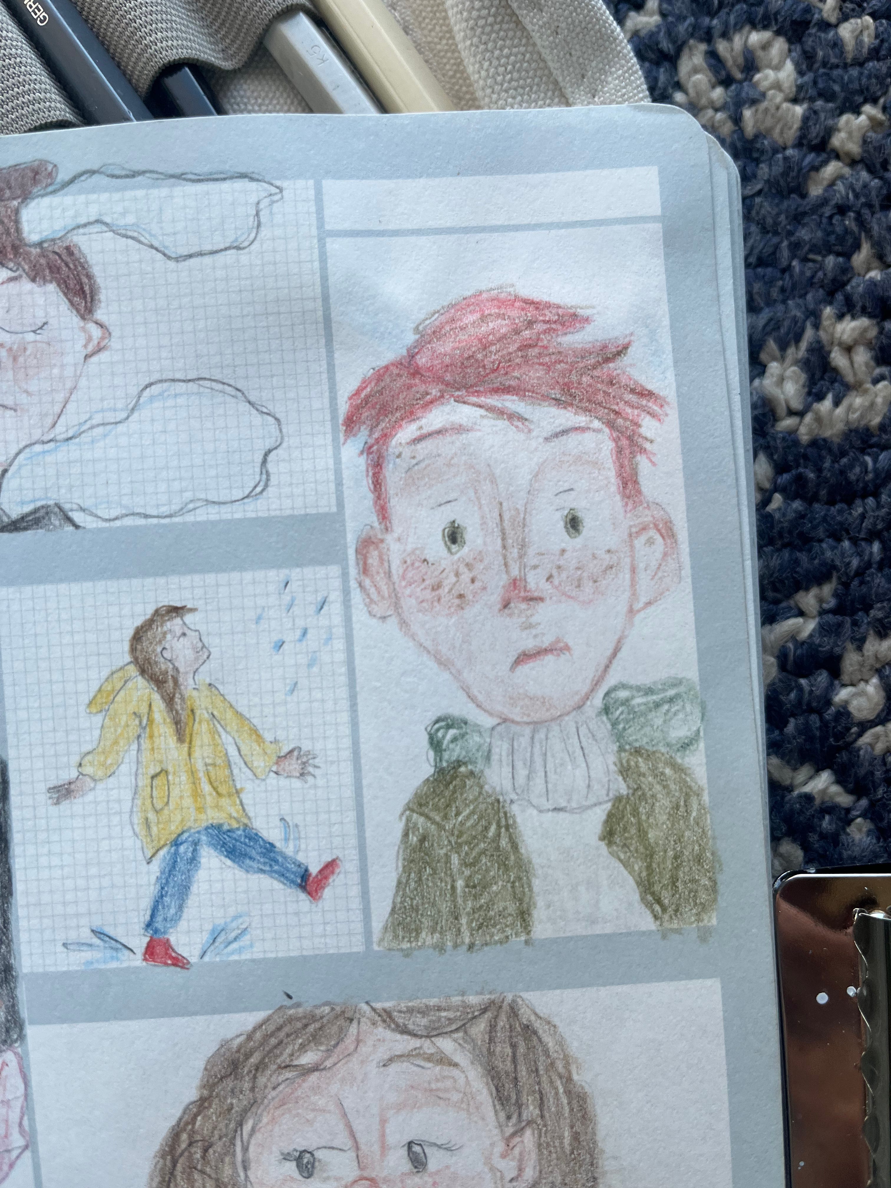 I did- I did! Keep up my short and sweet (and highly constrained) square in the journal project. I did allow myself to expand out into my favorite colored pencils and palette, instead of being restricted to that limited 24 pencil set from one brand. I also sort of let my hand wander where it would; they aren’t all character studies or people. I went with what ever brought joy that day. The guy from the beginning of my letter was modeled off of a sculpture, and I really like how he turned out. Here they are below. I’d love to hear what your favorites are or what caught your eye. I haven’t been sharing these to social media, just here, and it’s been a nice change. I kind of miss hearing what people like about them though- it helps me to learn and refine. So do tell!
